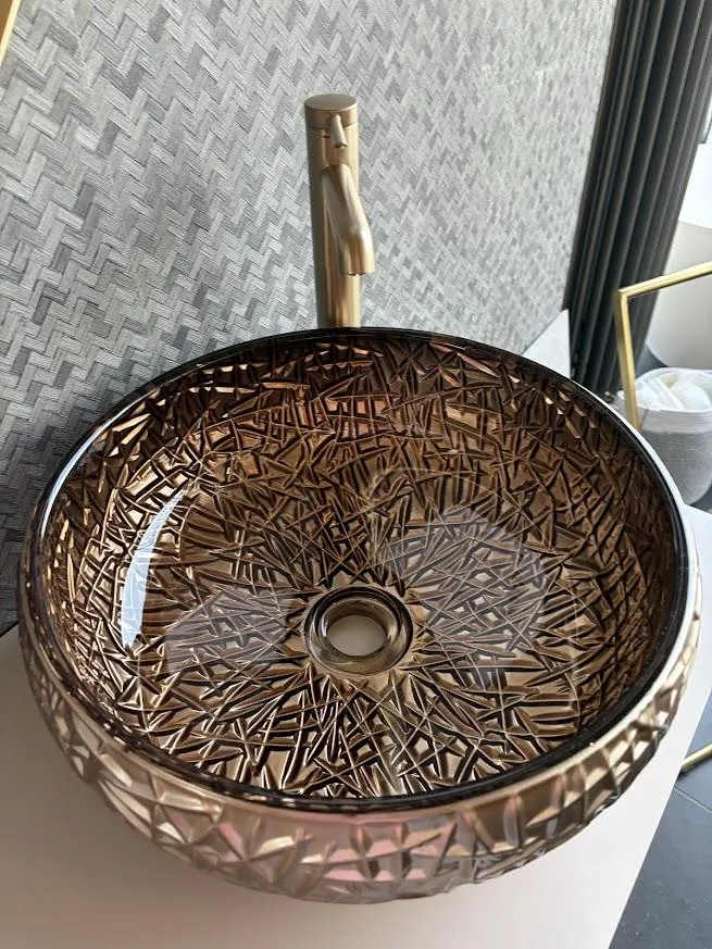 Spiegel rond afw. goud, keramische wastafel spoeltafel links en onderkast beton groen met enkele lade.